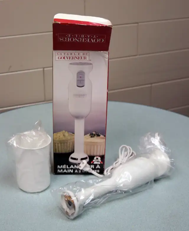 Conveniently blend, mix, puree, and whip with one versatile tool. Blend in the cooking pot and other containers. Simple to use with 2 speeds and easy-grip design. Easy cleanup with stainless steel blades.